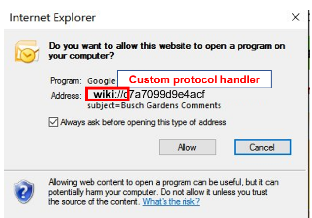 For example, when the program is executed as shown in figure below, a specific string is transmitted through the custom protocol handler (wiki://). The string is a hexadecimal string encoding of the value encrypted by Blowfish.