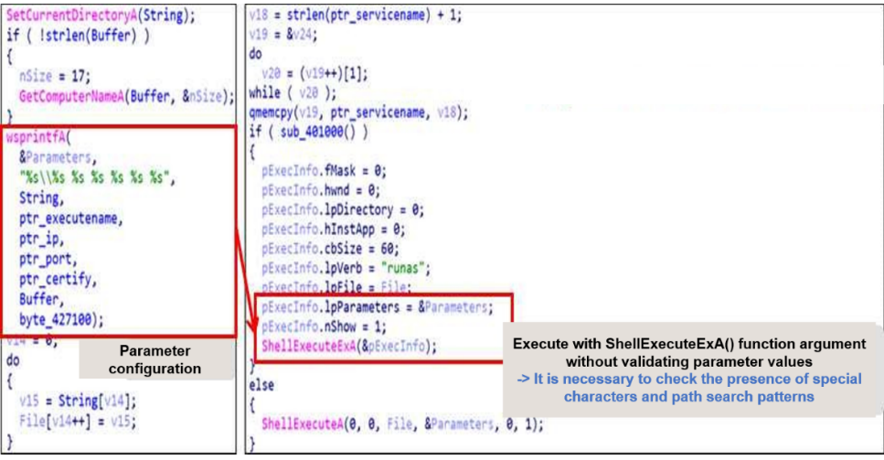 The decrypted string is separated by the strtok() function and stored in several variables, and the variable is finally used in the string passed to the ShellExecuteA() function and executed as an argument value, as shown in the figure below.