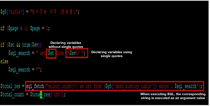 If you check the string configuration of the sql_fecth() function argument by inserting a random string into the st variable and the sv variable, the sv variable is recognized as a string by declaring it through a single quote, but the st variable is composed of a part of the SQL statement.