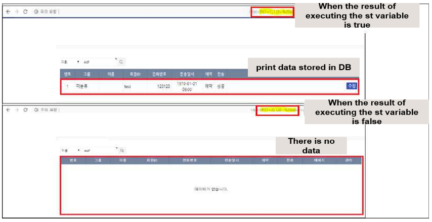 Therefore, if the execution result of the st variable becomes true unconditionally, all values stored in the table can be output regardless of conditions. As a result of inserting, as shown in the figure below, if the result of the SQL statement entered is True, data is output, and if it is False, data is not output.
