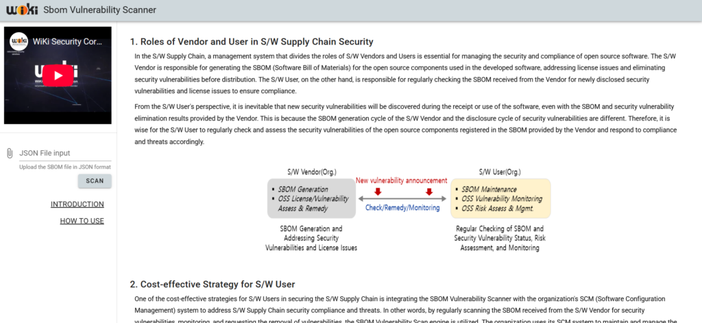 From this perspective, we are releasing an SBOM vulnerability scanning website that can be used for SBOM management and security vulnerability analysis. This website is available to anyone, and by uploading an SBOM file in JSON format, users can scan for all known security vulnerabilities and view the results through a simple and intuitive interface.